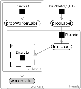 In Figure 7.10 we have used a Dirichlet prior over probWorkerLabel, just like we did for probLabel. We can choose this prior for each row of the conditional probability table to encode any assumptions we want to make about the probabilities in that row. Specifically, we will assume: