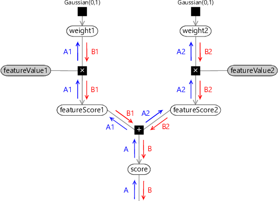 - A parallel schedule which processes the two weights at once. In this schedule, first the messages marked A are passed. Then both sets of messages (A1 and B1) and (A2 and B2) are passed, where the messages from the plus factor are computed using the previous B1 and B2 messages. Finally, the message marked B are passed.