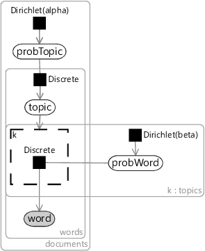 Finally, probTopic is a probability distribution over topics. It lives inside the plate over documents, showing that each document has its own distribution over the topics in that document.