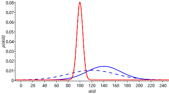 The downward message (9) is unchanged, and so we can finally compute the Gaussian approximation to the posterior distribution of Jskill as the product of two Gaussians, which gives the final result of a Gaussian with mean 140.1 and standard deviation 28.5.